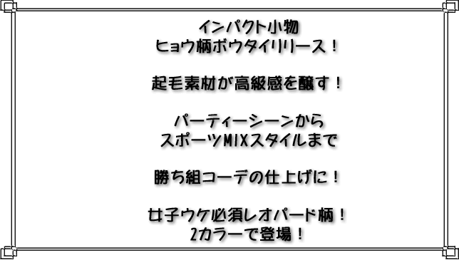 | スタッフコメント | ヒョウ柄ボウタイ新作入荷です!チェックやストライプは定番ですがレオパードは初お目見えです^^シンプルなコーデに取り入れるだけで雰囲気が一気に変化しますね^^LetsTry^^ |