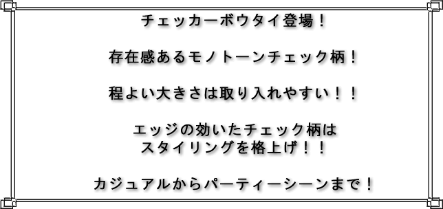 モノトーンチェッカーボウタイ登場!存在感あるモノトーンカラー!カジュアルシーンからパーティーシーンまで!!