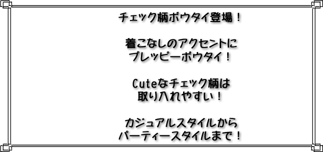 キュイー発信!チェック柄ボウタイ登場!幅も程よくジャケットに素敵に映える^^チェック柄もCuteに5カラー登場!ポリエステル素材でソフトな仕上がりは普段使いからパーティーシーンまで使える^^大人スタイルにぜひ確保したい!首回りは調節可能です。