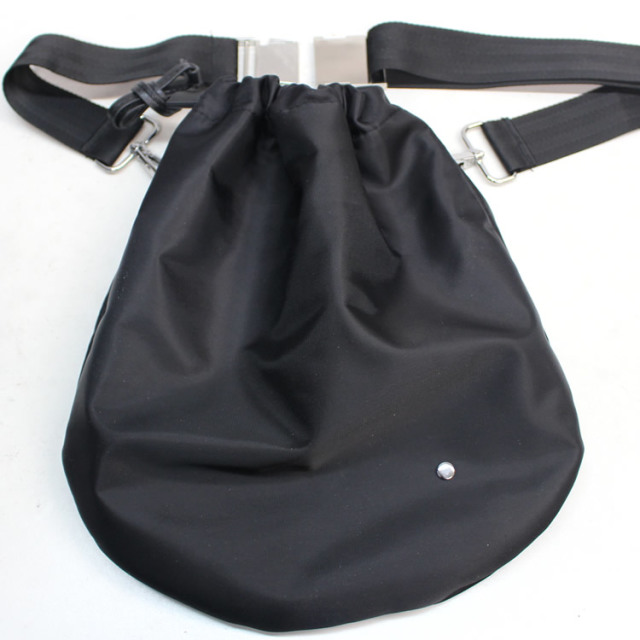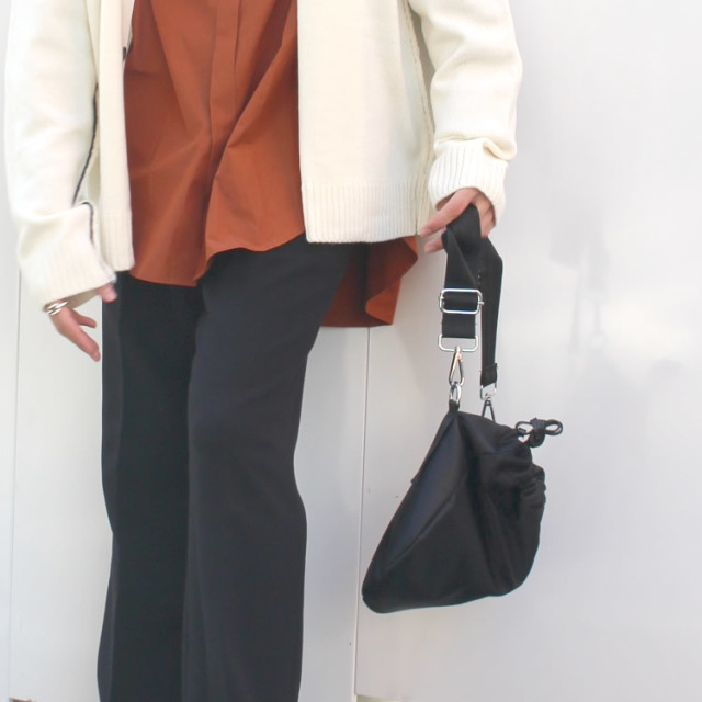 キュイー発信 2ウエイ巾着ショルダーポーチ登場!小ぶりな巾着袋にショルダーベルトが付いた!シンプルなデザインは様々な着こなしに調和する!