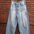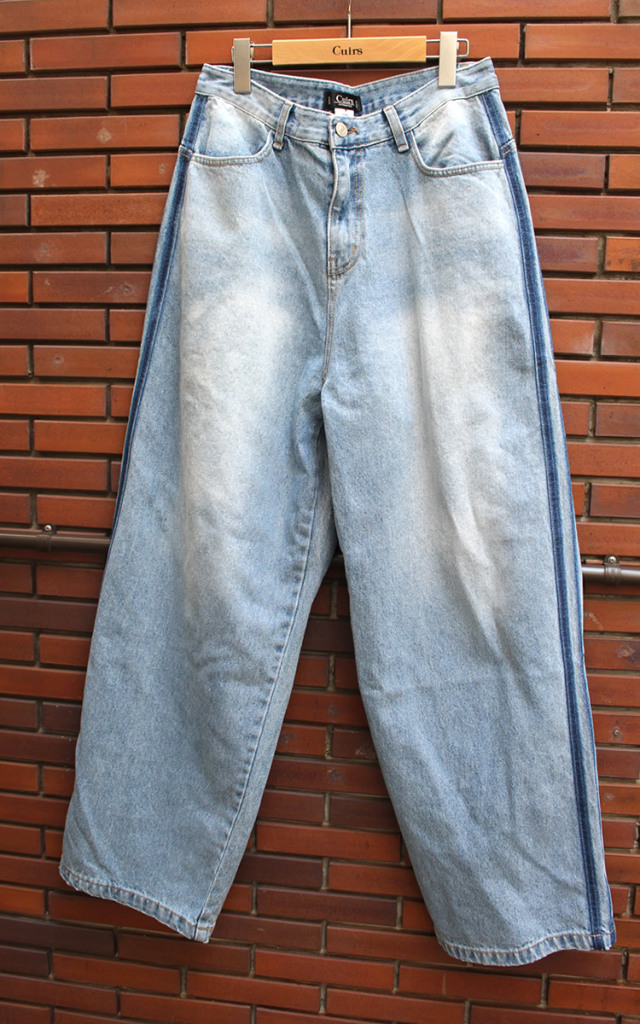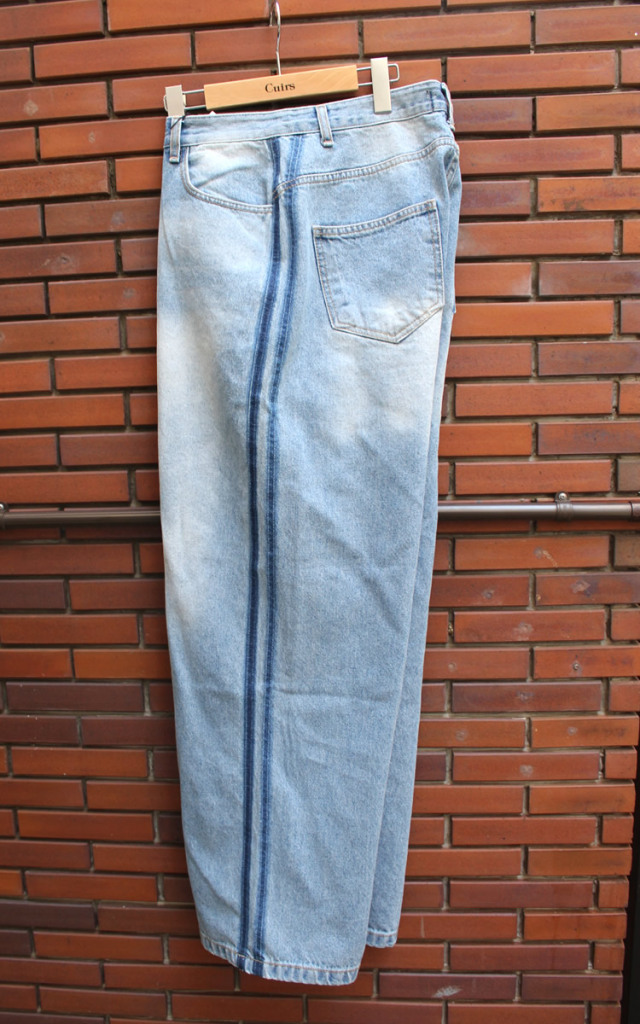 キュイー発信 ブリーチダメージトラックデニムパンツ登場!ダメージブルーデニム生地!こだわりの立体感あるワイドシルエットデニム!ダメージも程よいウオッシュ仕上げ!アクセントにトラックラインがアクセント!素材はコットン100%!Mサイズのみで登場! | モデルコメント |
