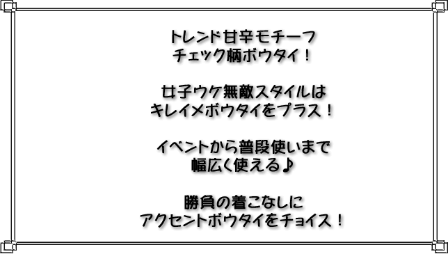 | 特徴 | キュイー発信:新作チェック柄ボウタイ登場!シワ加工が甘くてCute!モテコーデにボウタイをチョイス!着こなしにインパクト与える!ベルトのサイズ調節も可能でクリップもつけやすい! |