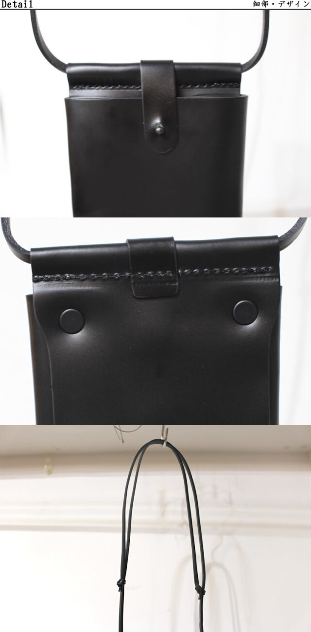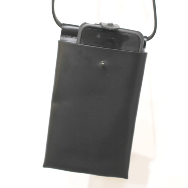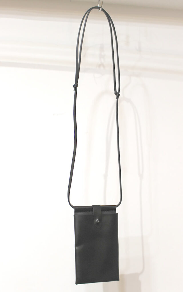 キュイー発信 レザーアイフォンケース!アイフォン収納に映えるシンプルデザイン!持ち運び便利な肩ひも付きケース!光沢感ある本格レザー仕様!着こなしに合わせやすいブラックで登場! | モデルコメント |