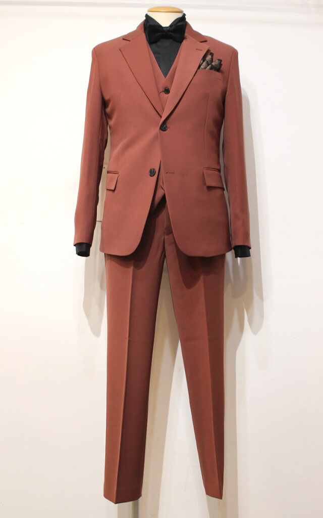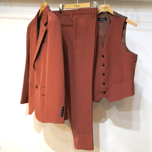 ベストも揃って3ピースとして着まわせる!ややタイトなシルエットはすっきりとした仕上がりでクラシック&エレガントな着こなしを演出する!カラーもこだわりののパントンカラーで堅く決め過ぎないカジュアルな要素もプラスしている!これからの季節にONEセットを是非確保したい!S・M・L スリーサイズ 3カラーで登場