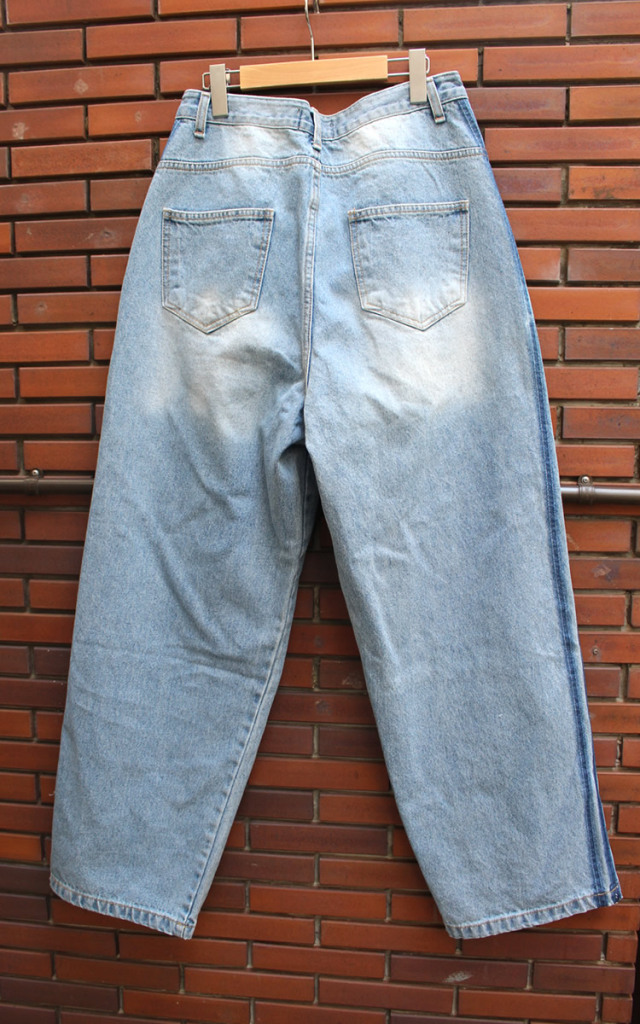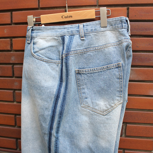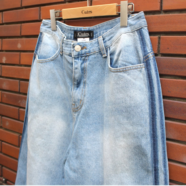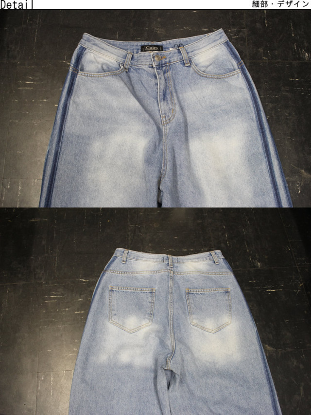 キュイー発信 ブリーチダメージトラックデニムパンツ登場!ダメージブルーデニム生地!こだわりの立体感あるワイドシルエットデニム!ダメージも程よいウオッシュ仕上げ!アクセントにトラックラインがアクセント!素材はコットン100%!Mサイズのみで登場!