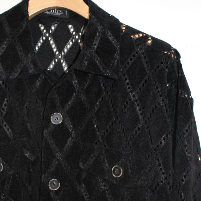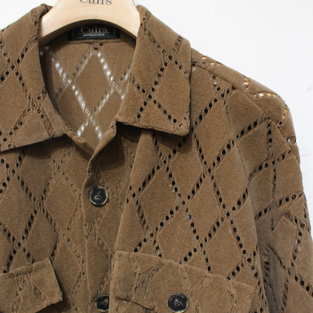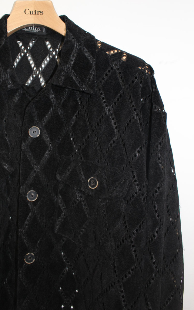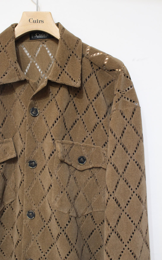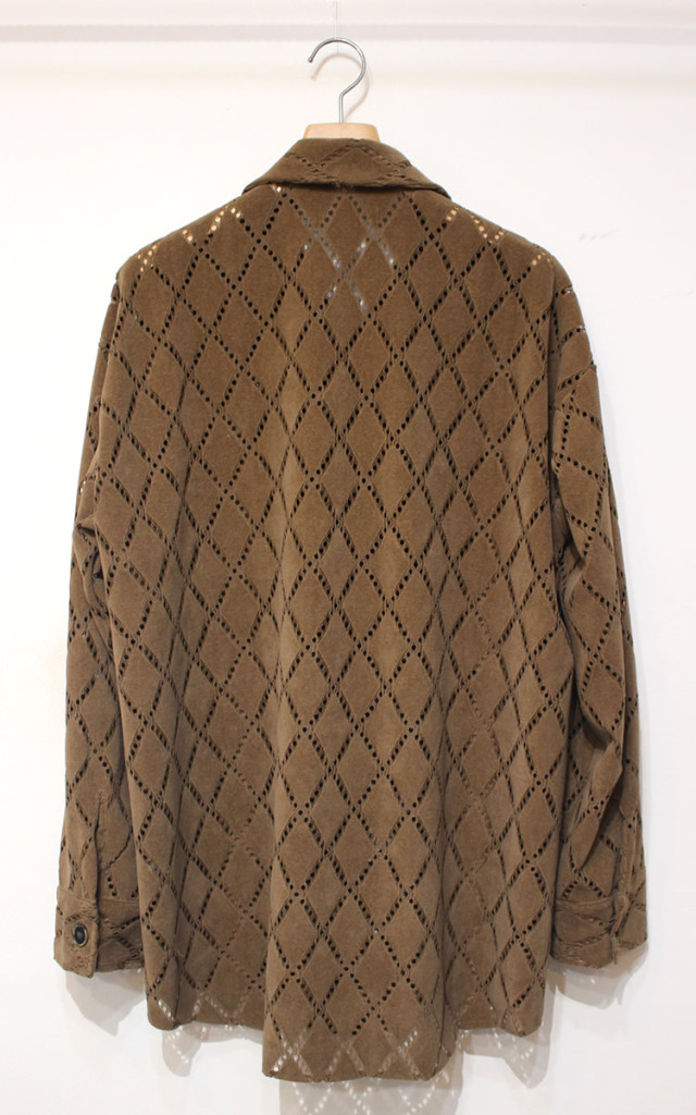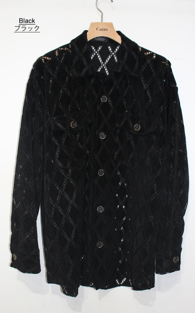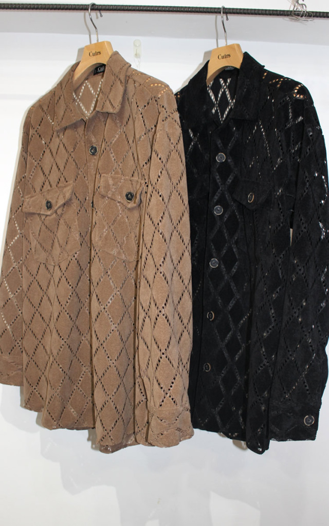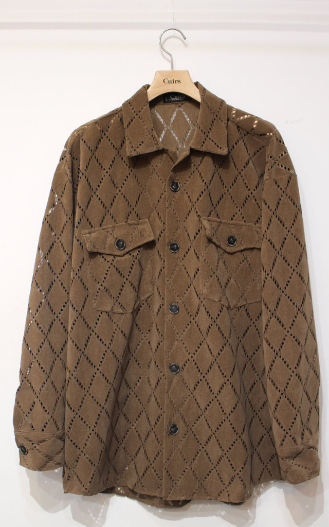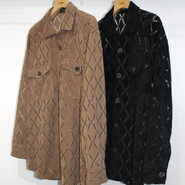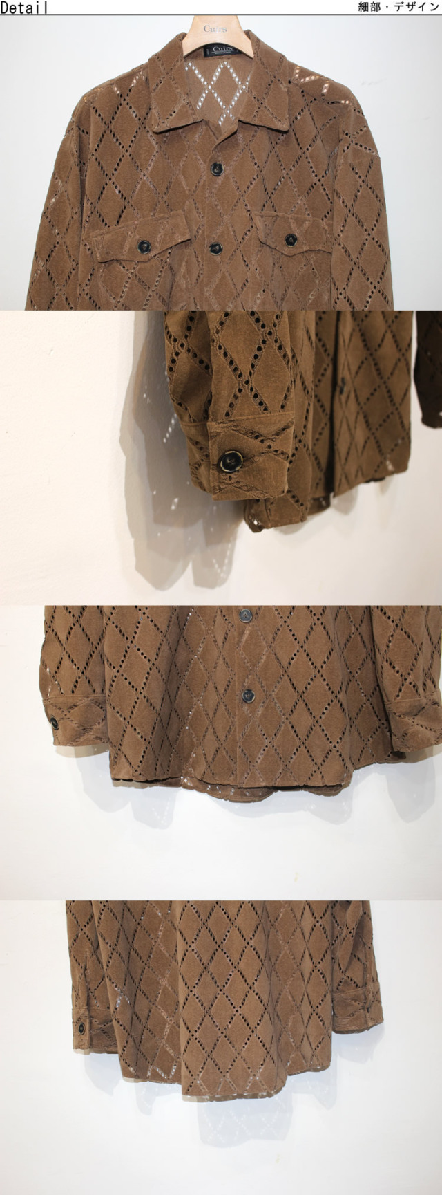 キュイー発信 立体的なクロッシェが存在感のあるスエードシャツ登場!スエード生地を立体的な透かし柄クロッシェシャツに仕立てた!透け感あるクロッシュは清涼感あって真夏でも着まわしやすい! オープンカラー、フロントボタン、裾はストレートヘム仕様!クラシカルな仕様はアウターとしても着まわせる!2カラーで登場!