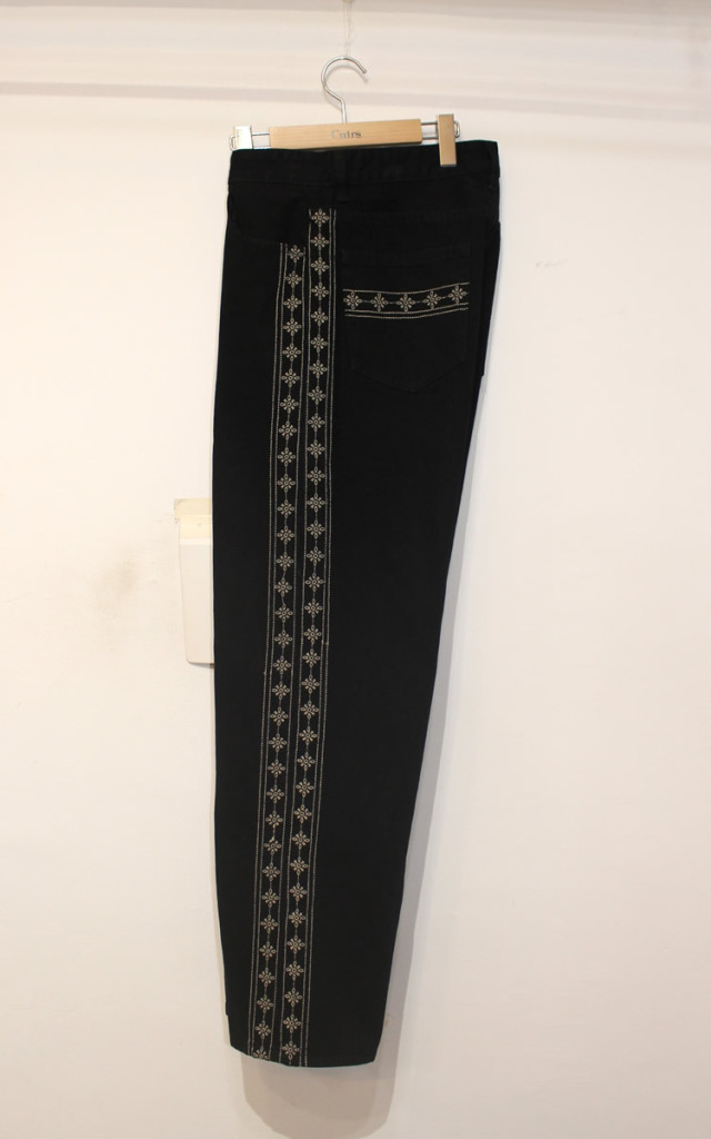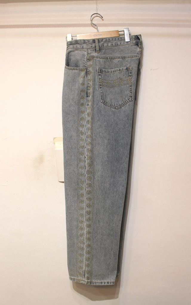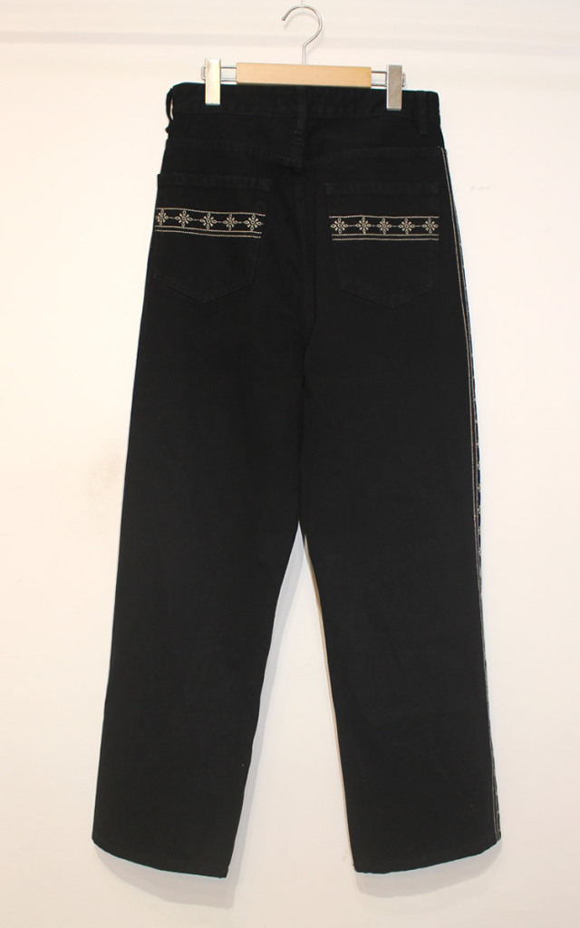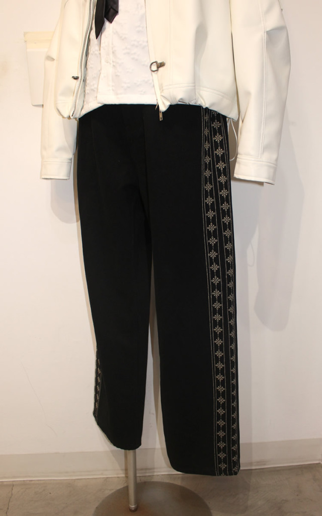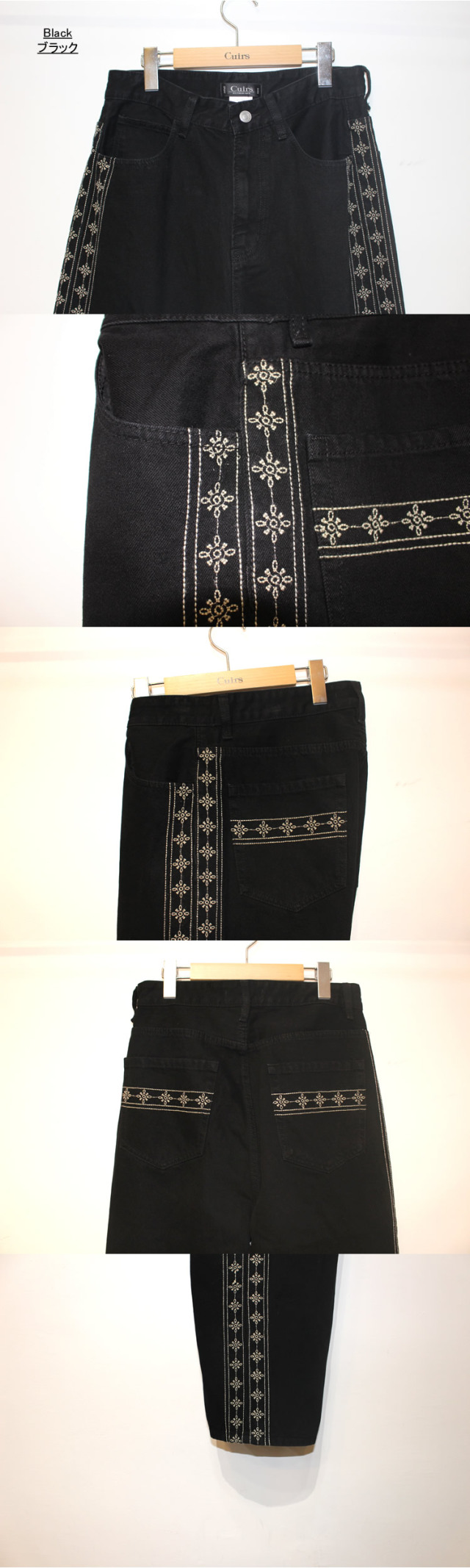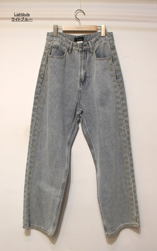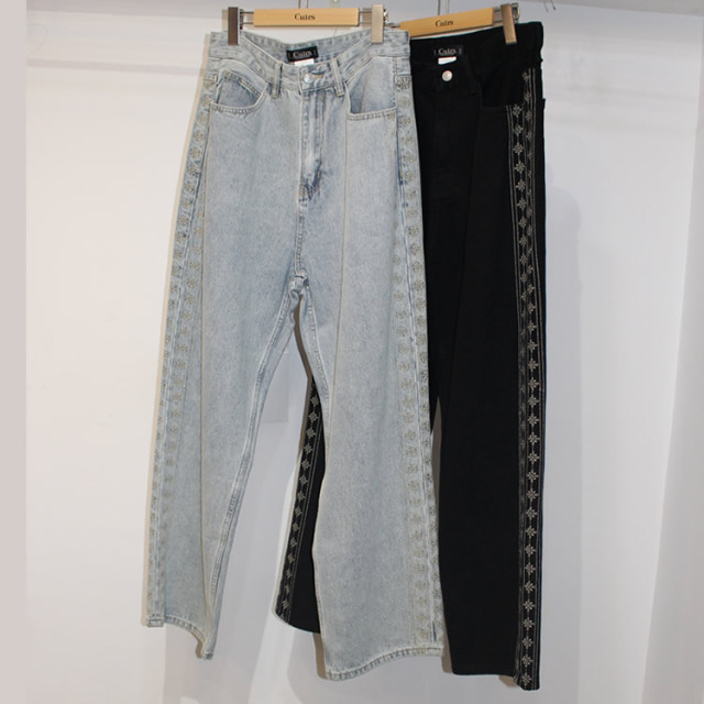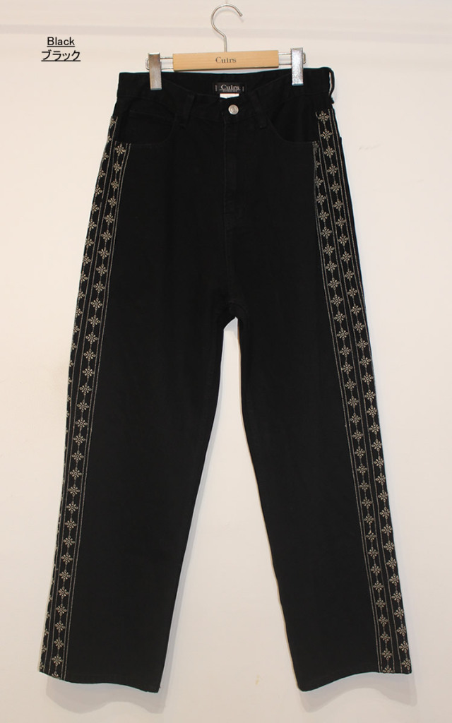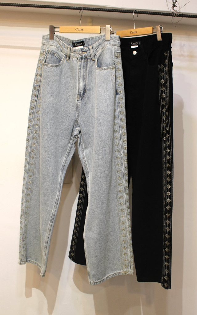 キュイー発信 サイドに刺繍を施した刺繍トラックバルーンデニムパンツ入荷! 腰周りから膝にかけてゆとりがあり、裾に向かってすぼまるバルーンパンツ! デニム生地のサイドに刺繍を施した新たな1着! 程よく膨らんだシルエットにサイドの可愛い刺繍が目を引く! 綺麗目すぎない印象と、脚長効果抜群のバルーンシルエット! 着こなしとしてはタイトな長袖のトップスが相性よくトレンド感を演出する! また、あえてオーバーシャツとの組み合わせもコナレ感を醸すこれも◎ ブラック・ライトブルーで登場!