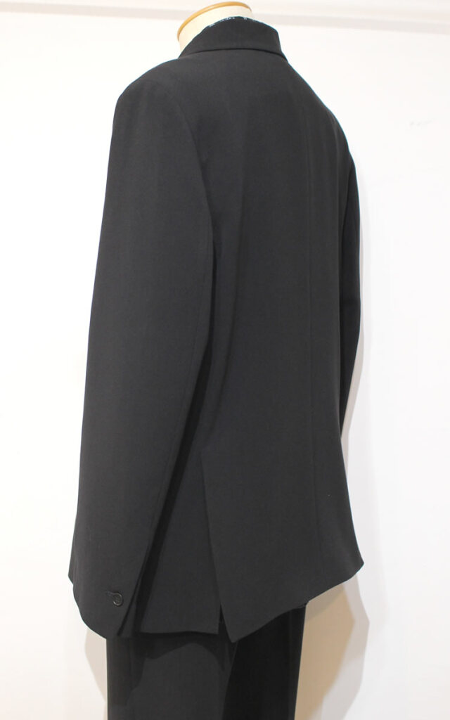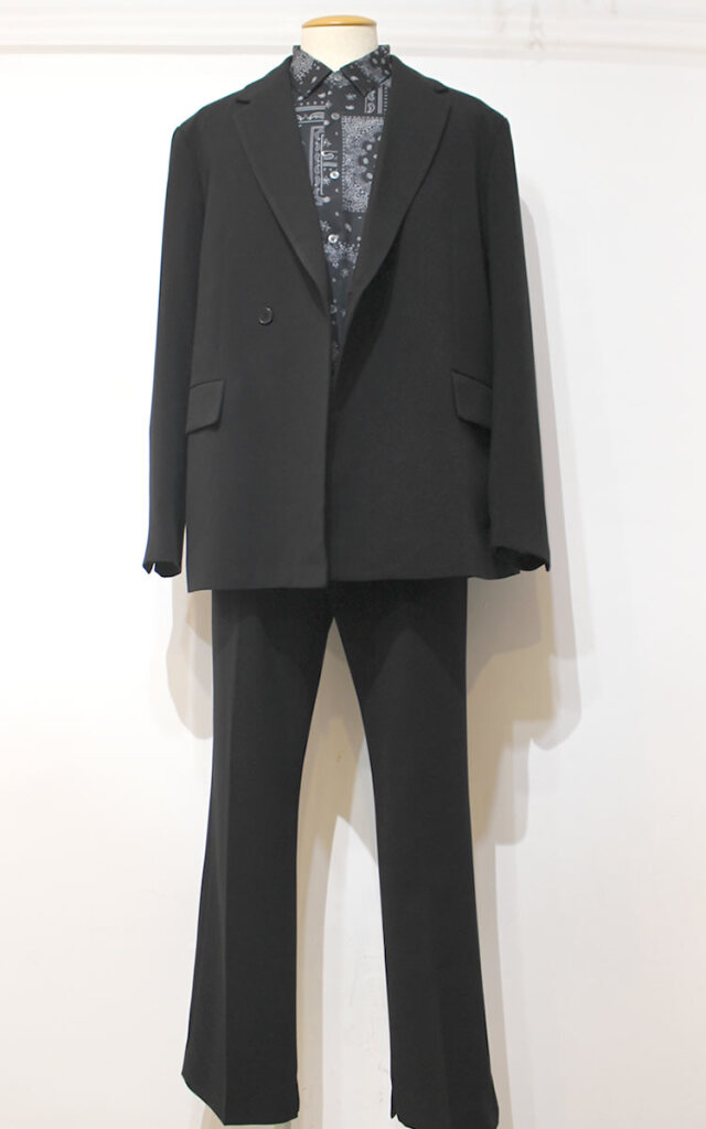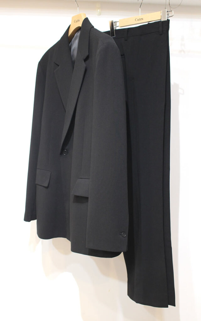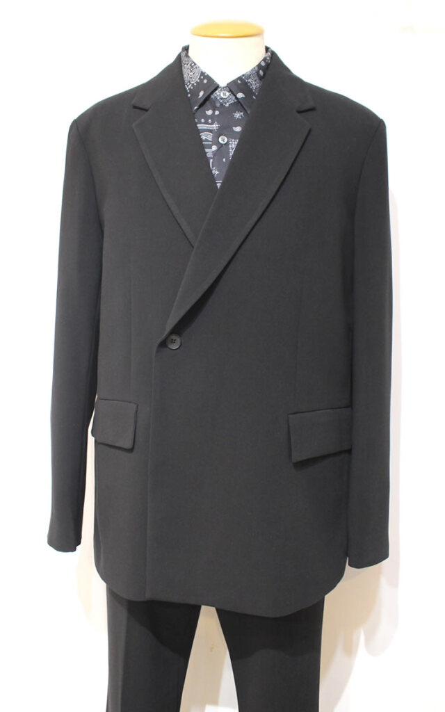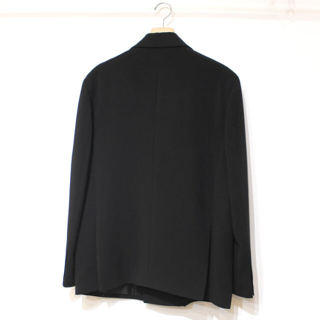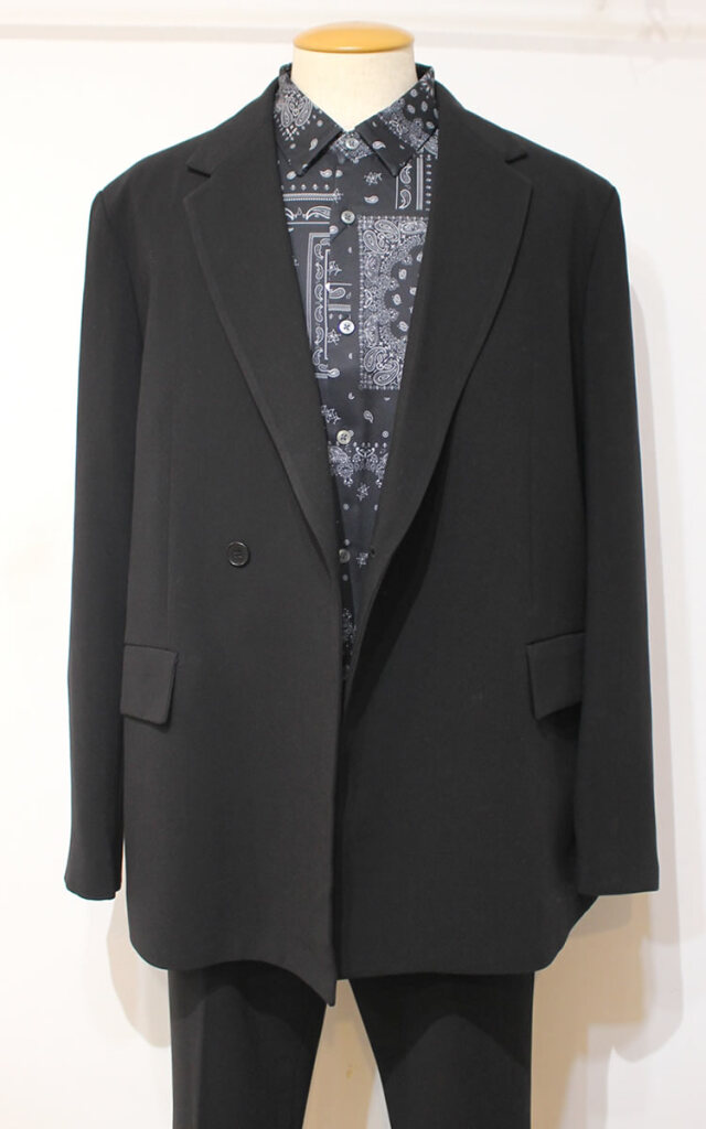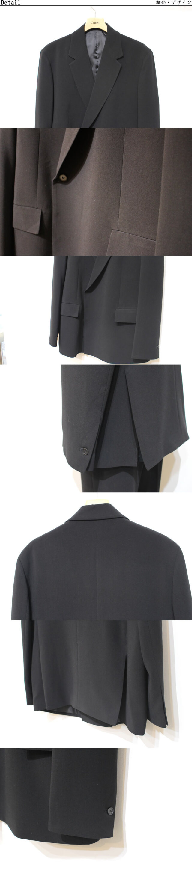 キュイー発信 ダブルセットアップジャケット!クラシカルな表情とモダンな雰囲気を兼ね備えた1品。やや広めに採られたアームホールや身幅で短めの着丈がトレンドスタイルを構築しています。ボックスシルエット、大きなポケットがカジュアルにもキレイめにも合わせられるダブルジャケットをコントロール!同素材のパンツとの組み合わせでセットアップスーツとしてもオススメです!程よい厚みと適度な落ち感でシワにもなり難く着用時のストレスを感じさせない仕立てを実現しています。ナチュラルシックなブラックカラーでジャケットならではの構築感を意識しながらもブルゾンのように気軽に着用して頂きたい逸品です!