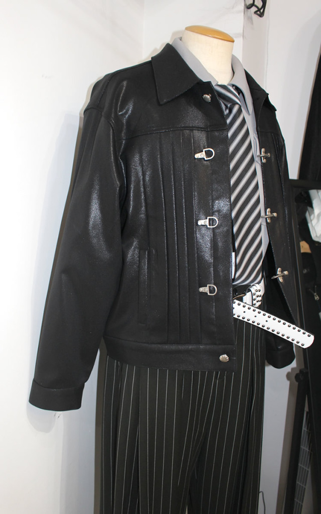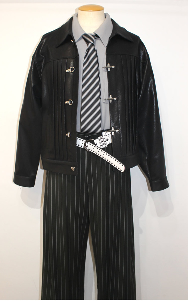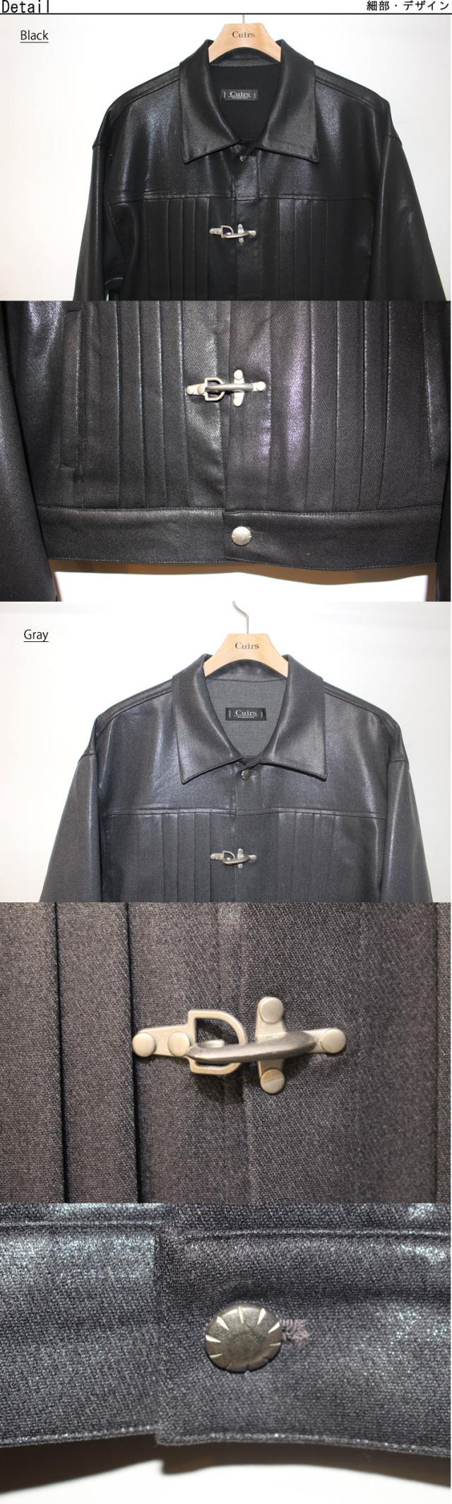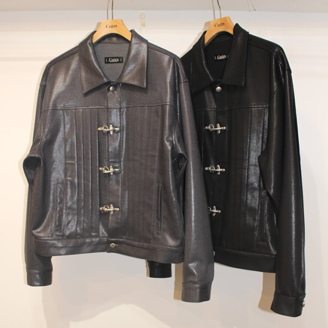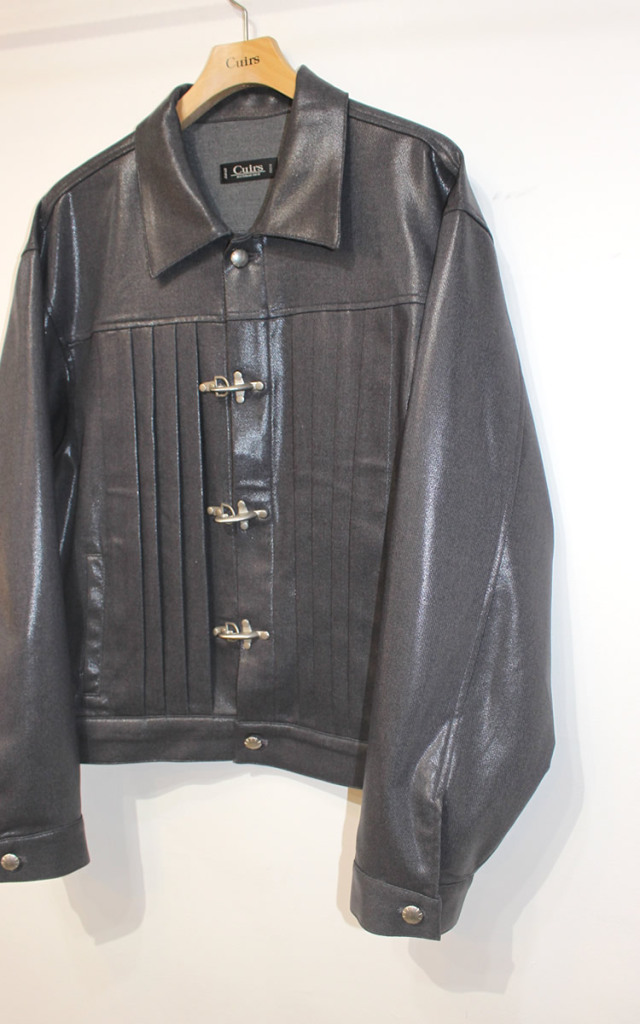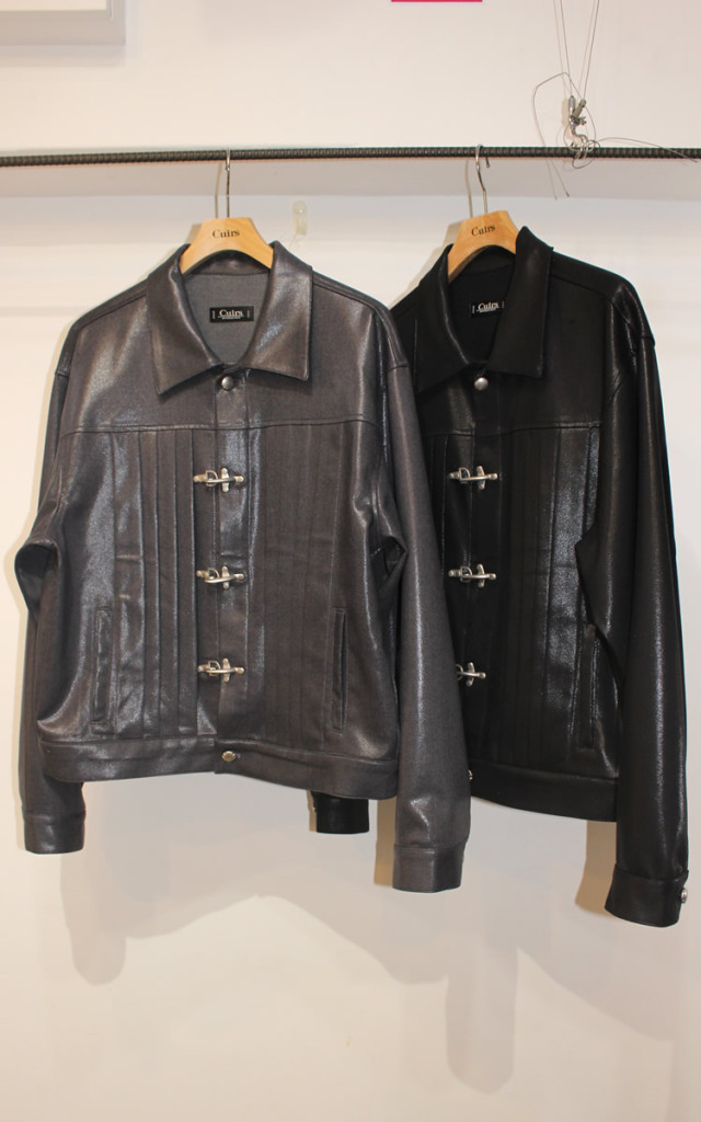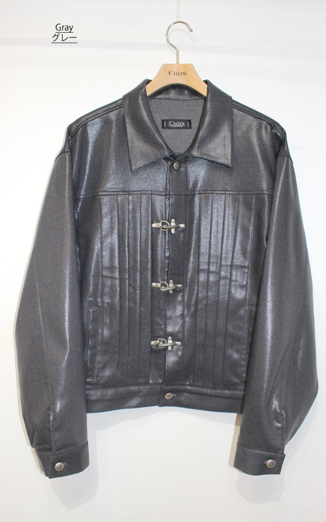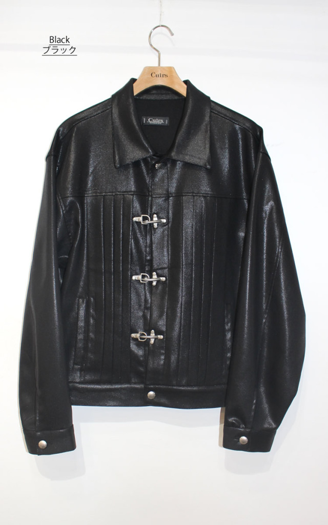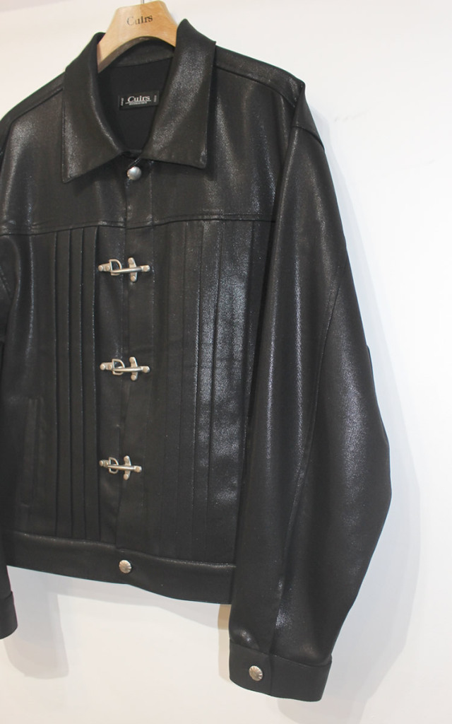 キュイー発信 消火ホースを固定する金具をモチーフに考案された通称(ファイヤーマンバックル)を施したレザージャケット入荷! ソフトなフェイクレザーを使用しフロントとバックのプリーツがアクセント! シンプルなデザインながらセンスある仕上がりがこなれた印象! 光沢感ある合成皮革のを採用して高級感も確保! ゆとりあるクロップショート丈が今っぽく、羽織るだけでイマドキ感を演出! 太めのバギーやデニムパンツにも相性がよく、着まわしやすい! 完成度の高い最新クロップレザージャケット登場!