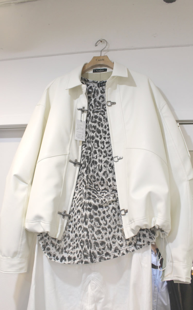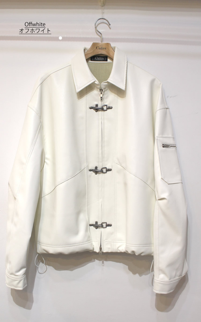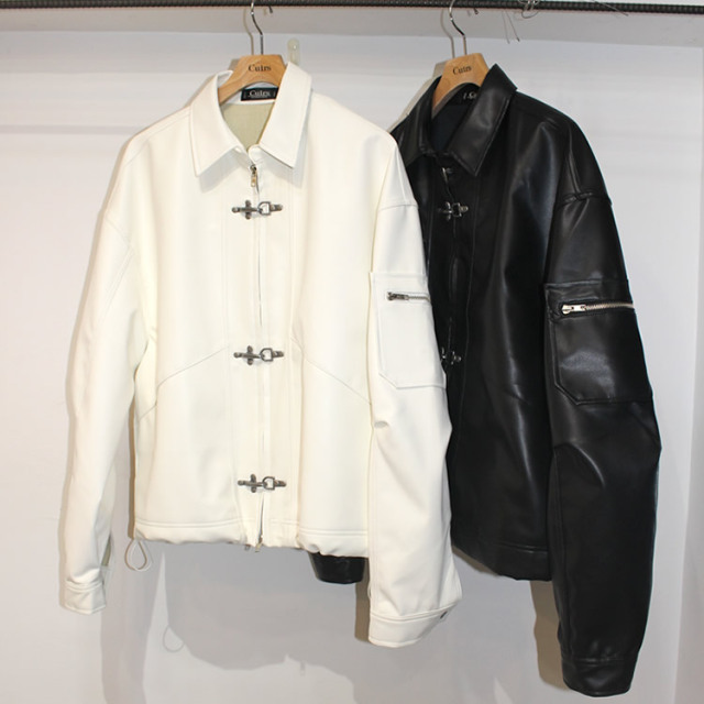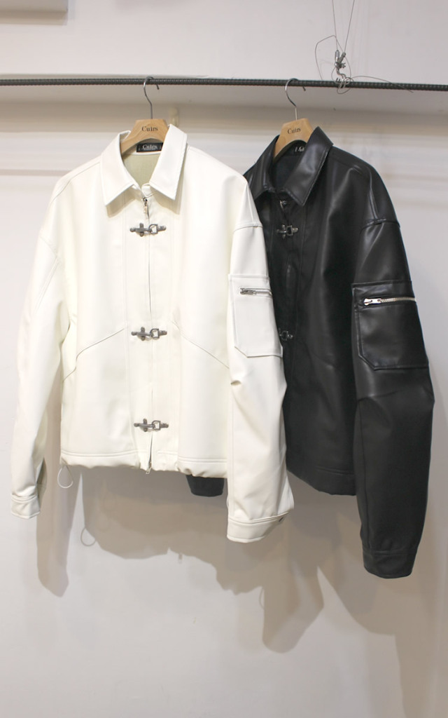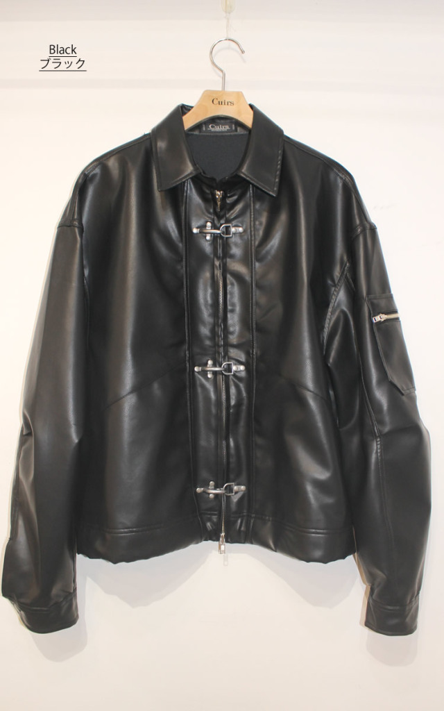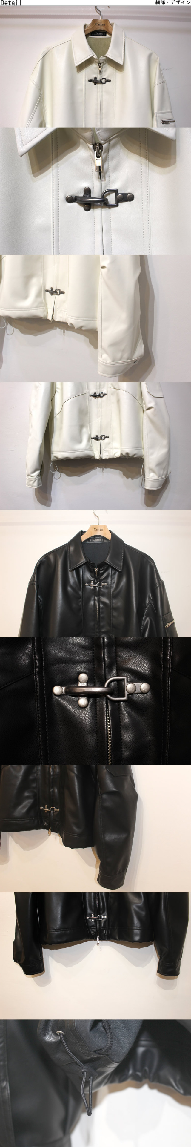 キュイー発信 消火ホースを固定する金具をモチーフに考案された通称(ファイヤーマンバックル)を施したレザージャケット入荷! ソフトなフェイクレザーを使用し裾の調節可能なドローコート仕様! シンプルなデザインながらセンスある仕上がりがこなれた印象! 光沢感ある合成皮革のを採用して高級感も確保! ゆとりあるクロップショート丈が今っぽく、羽織るだけでイマドキ感を演出! 太めのバギーやデニムパンツにも相性がよく、着まわしやすい! 完成度の高い最新クロップレザージャケット登場!