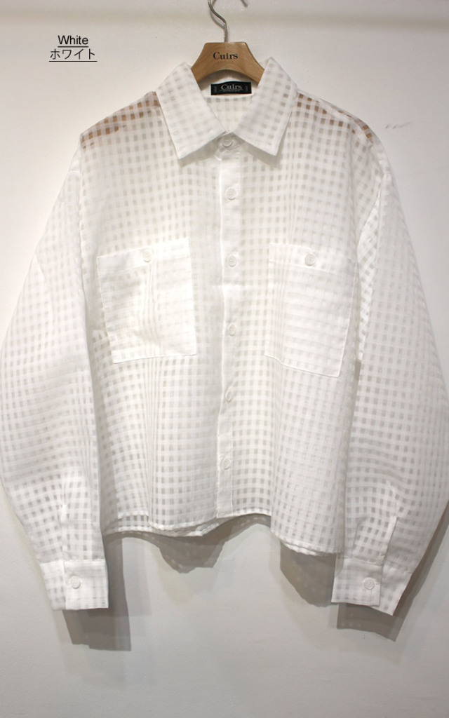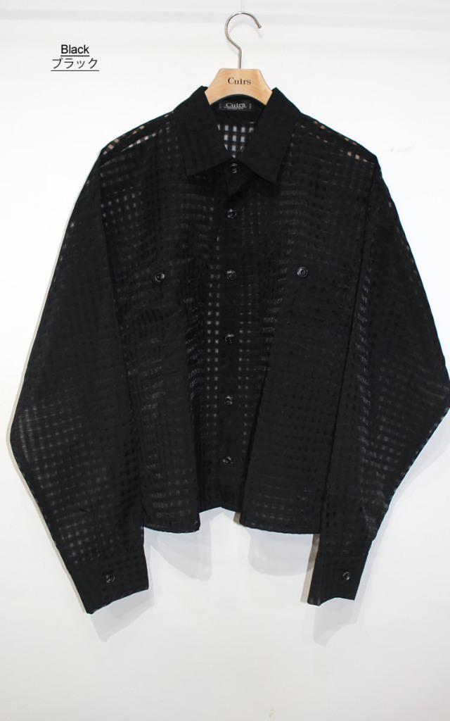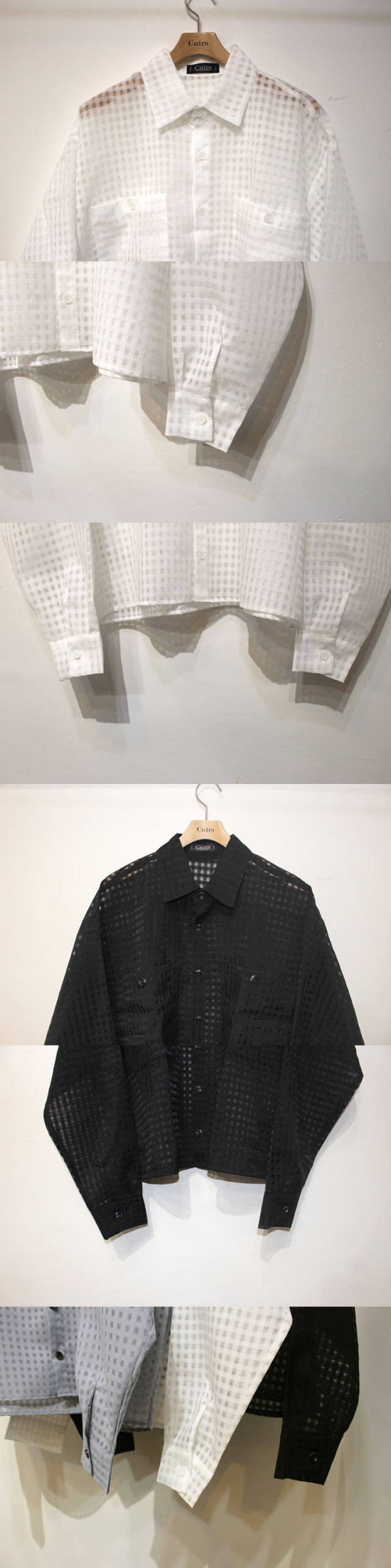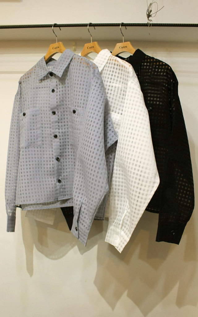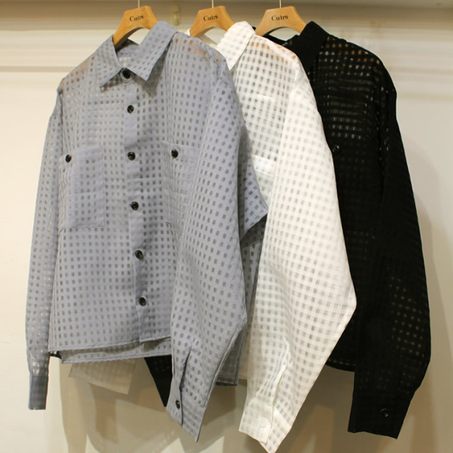 キュイー発信 シースルーチェッククロップシャツ入荷! 透け感のあるシアー生地にチェック柄がインパクトあるシースルーシャツ! ややゆったりとしたサイジングは一枚でも重ね着でも個性ある着こなしを演出する! カラーはシンプルなグレー・ホワイト・ブラックで入荷!