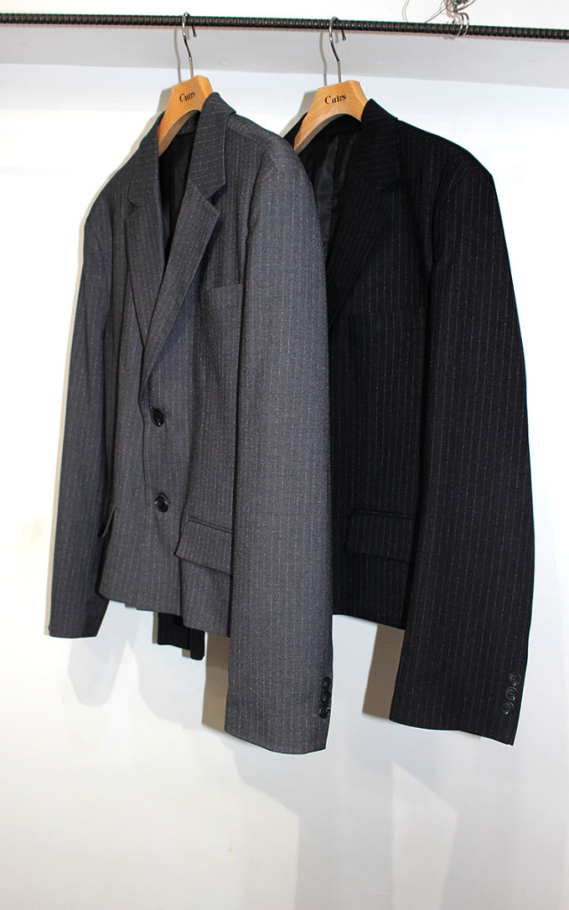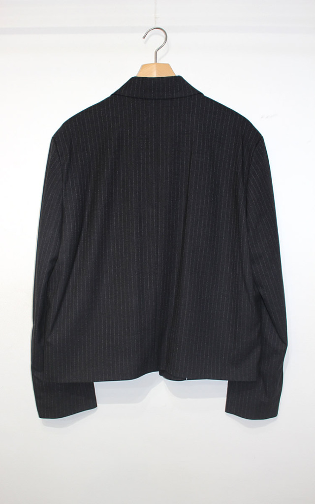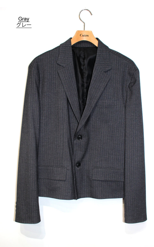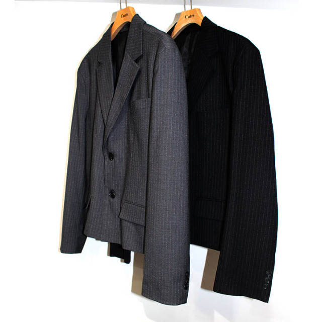 キュイー発信 ピンストライプが上質を感じるセットアップクロップジャケット入荷! 人気のクロップショート丈でピンストライプデザインはエレガンスで洗練されたスタイルを醸し出す! 身幅にゆとりを持たせたラフな着用感でパンツとセットアップで単体はもちろんカジュアルからビジネスシーンまで着まわせる! ブラック・グレーで登場!