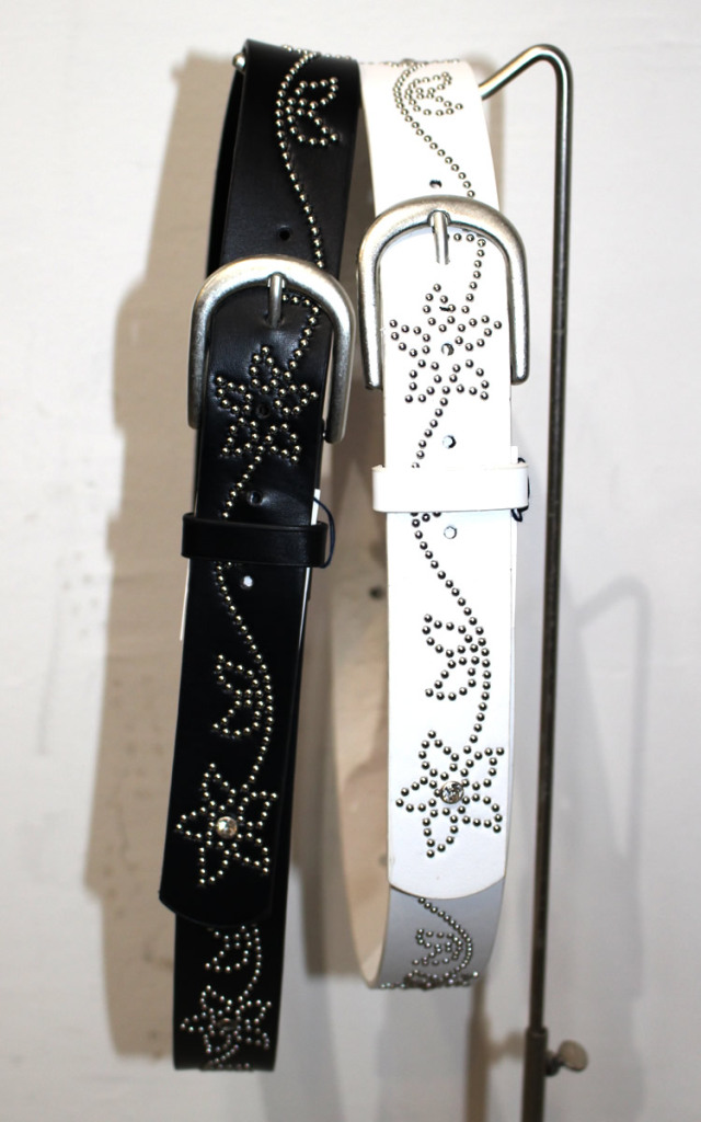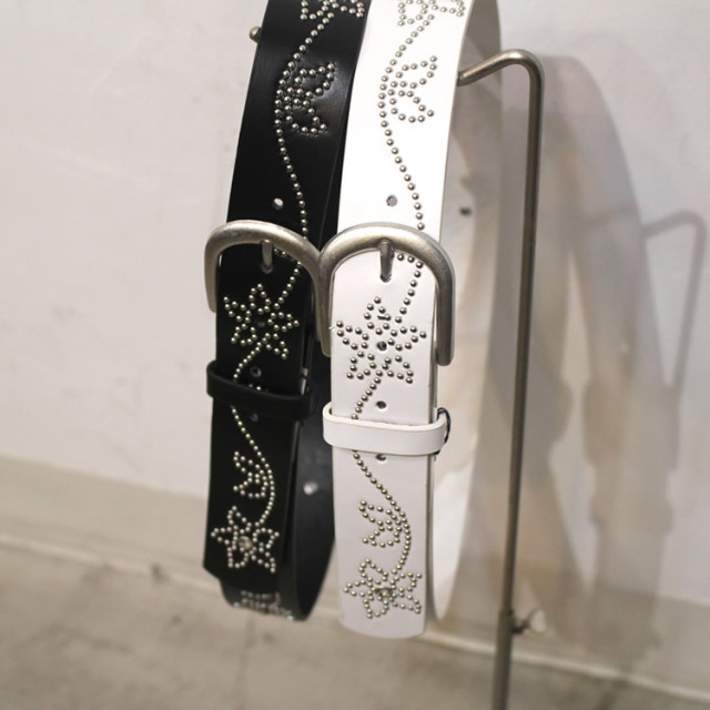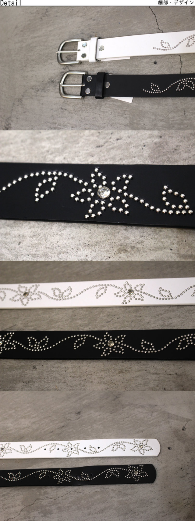キュイー発信 スタッズデザインを施し、ユーズド感のある仕上がりが魅力のレザーベルト入荷! 使い込むほどに味わいが増す合皮(合皮)を採用し、クラシックながらもモダンな印象を演出する! ベーシックなスタイルに取り入れるだけで、ヴィンテージライクな雰囲気がプラスされ、デニムやワイドパンツ、スラックスといった幅広いボトムスとも相性抜群! ウエスタン、ストリート、アメカジ、ロック、バイカースタイルなど、さまざまなファッションにマッチするデザイン! シンプルなシルバーバックルとユニセックスなデザインで使いやすい一本。 ウエストマークやタックインスタイルのアクセントとしてもおすすめ! ブラック・ホワイトで登場!