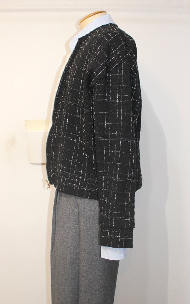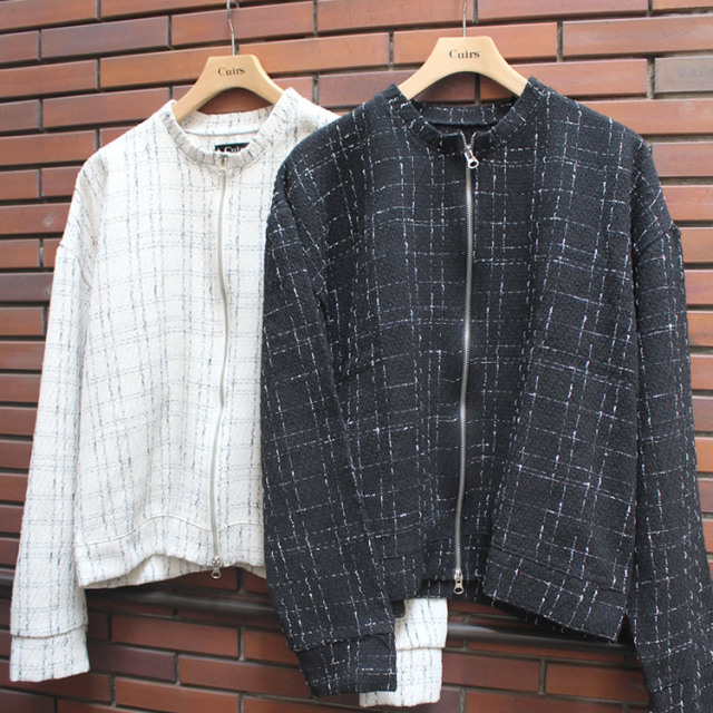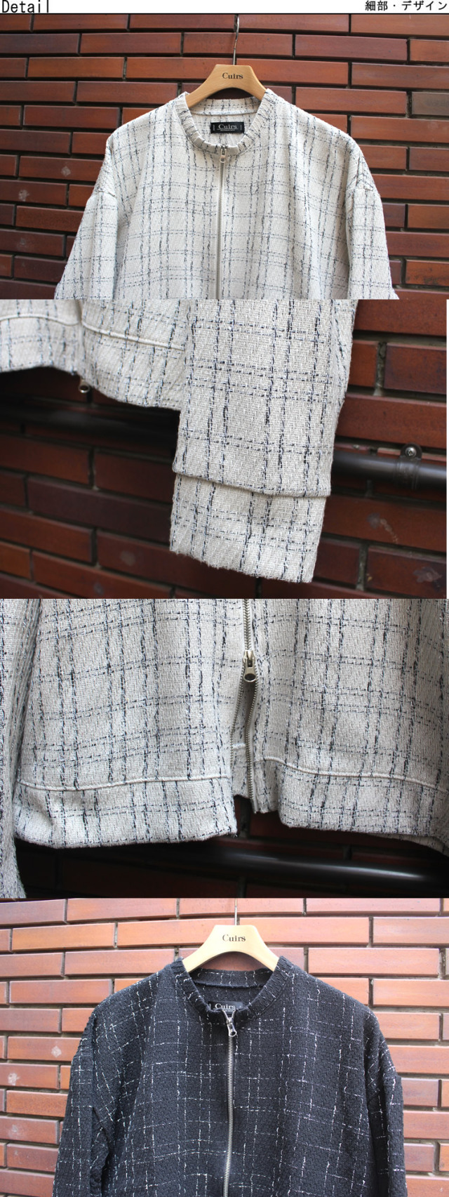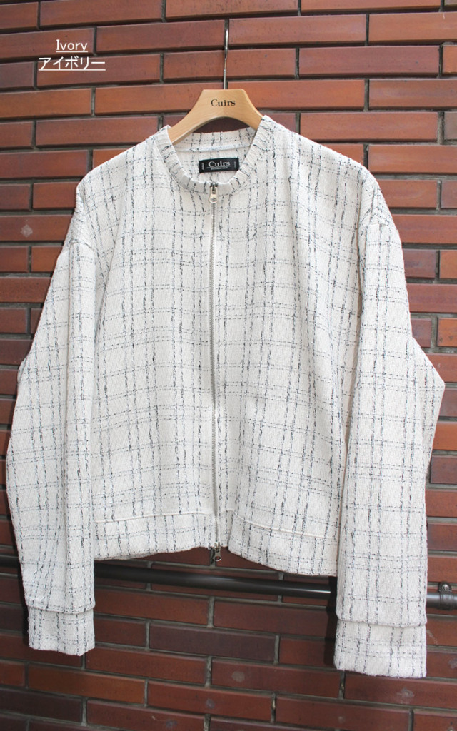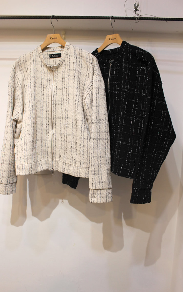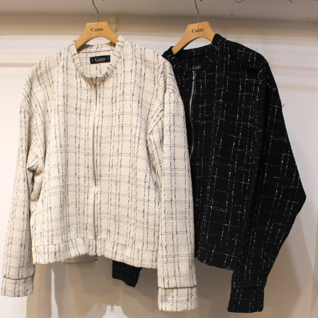 キュイー発信 今季トレンドとして注目されているZIPUPツイードジャケット入荷! 春らしいやわらかい素材感をセレクト! フロントのシルバージップは品よく演出! すっきりとしたノーカラーで綺麗めな雰囲気ながら、合わせるアイテム次第でどんなスタイリングにも着まわせるライトアウター! トレンドのツイード素材を採用し同素材独特のミックスされた糸により、表情豊かな仕上がりに仕上げた! 春先に使いやすい肉感で、初夏はもちろん秋も着回せるなどロングシーズン重宝される一着! ゆったりとしたワイドパンツから、スタイルアップが期待できる細身のフレアパンツまで幅広く対応! ブラック・アイボリーで登場!