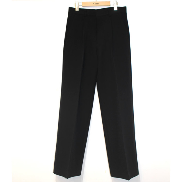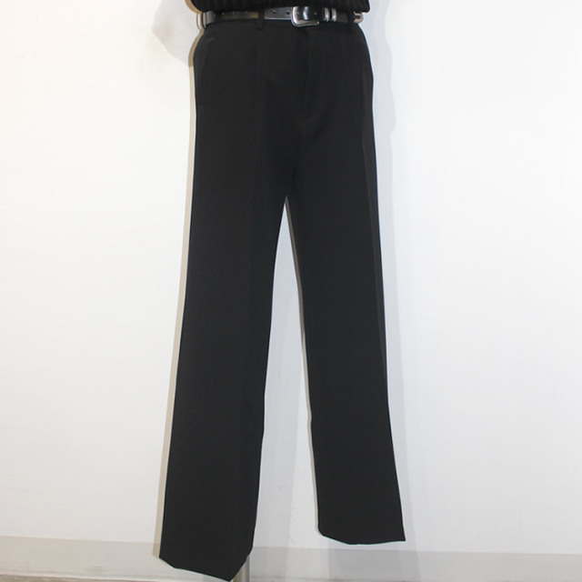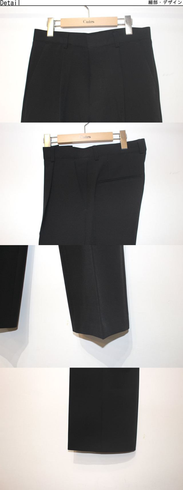キュイー発信 ワンタックバギーパンツスラックスリリース! シルエットはトレンドのバギーシルエット! 股上が程よく深く履きやすくハイウエストで綺麗なストレートパンツとしても着用! センタープレスがあることによりバギーシルエットの中でも太過ぎずよりスタイルアップ見えしドレス要素もプラス! 腰元にはワンタックを施し、ゆとりのある快適な着心地と洗練されたデザイン性を両立した! 素材は高密度で織られたポリエステルとスパンの混合でストレッチが効いて動きやすくダンスシーンでも活躍! さらに角度によって表情が変わる繊細なメランジ調の風合いが、高級感を引き立てる! カラーはシックで洗練された印象のブラック、3サイズで登場!