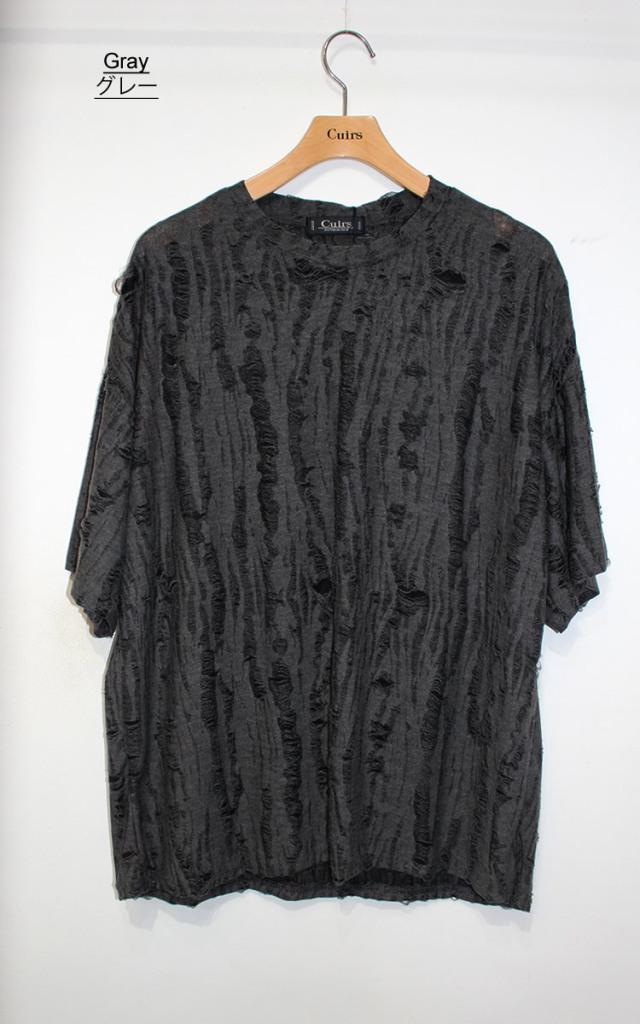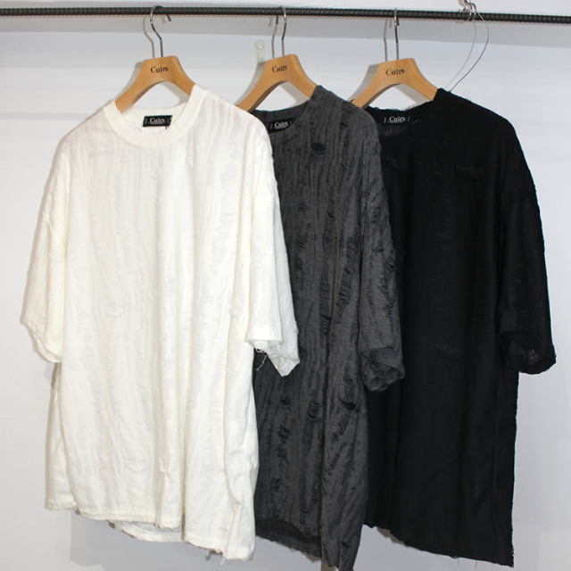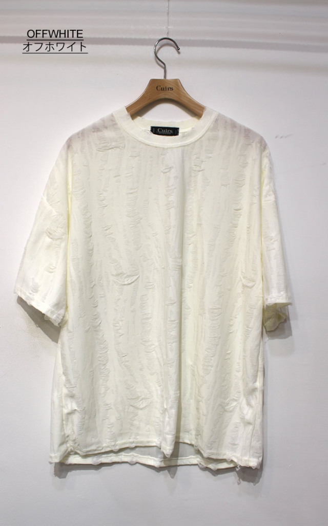 キュイー発信 大胆なダメージ加工が特徴的な、ストリート感あふれるTシャツ登場!ユニークなデザインがアクセントとなり、ルーズなシルエットでリラックスした着心地! ゆったりとしたオーバーサイズのシルエットでトレンド感UP! ストリートカジュアルにもぴったりのデザイン! 柔らかく通気性に優れて肌触りが良く、さらにヴィンテージ感のある風合いが魅力! カラーはオフホワイト・グレー・ブラックで登場!